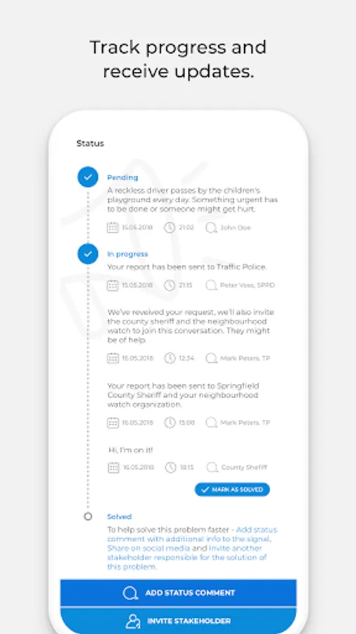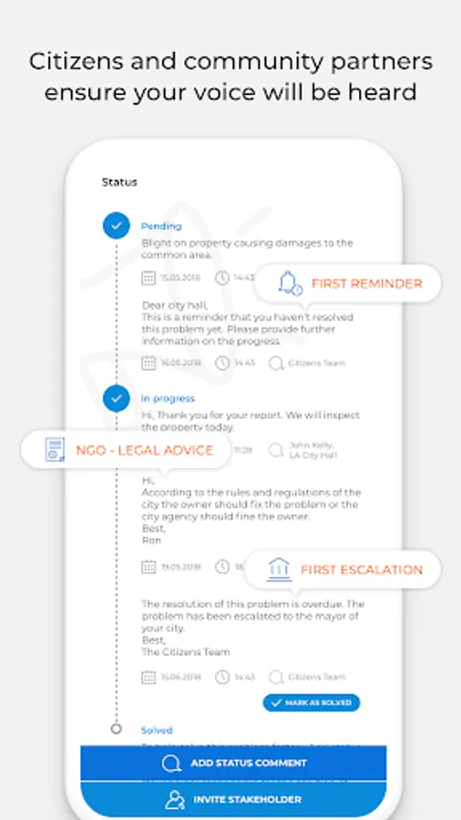 Once you submit an issue, the app sends your report to the appropriate local administration for resolution. You can track progress and receive updates directly in the app. Citizens (Grajdanite) ensures your voice will be heard by sending reminders and escalating issues when needed.
