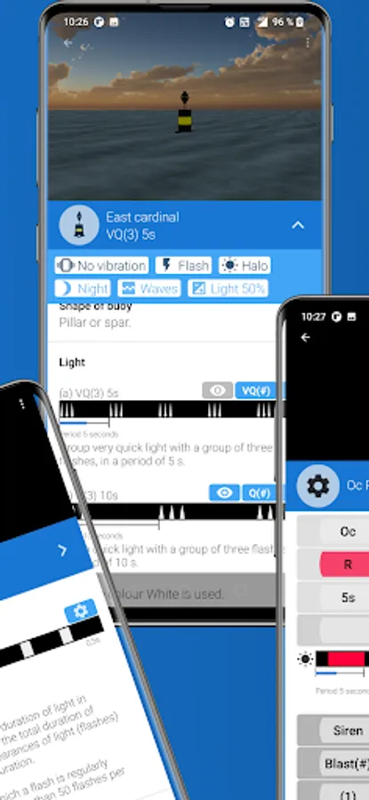 This app describes the IALA (International Association of Marine Aids to Navigation and Lighthouse Authorities) recommended buoyage and light aids to maritime navigation using 3D views and a light rendering engine.