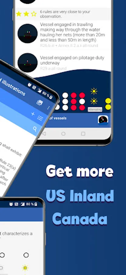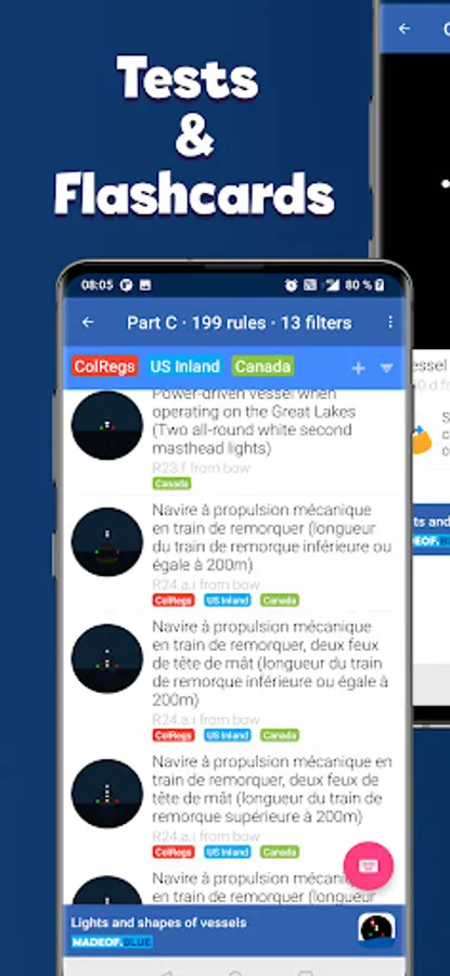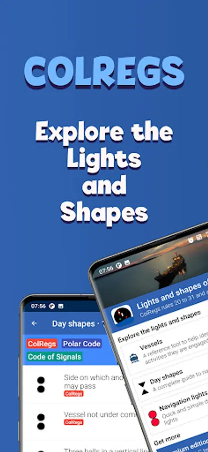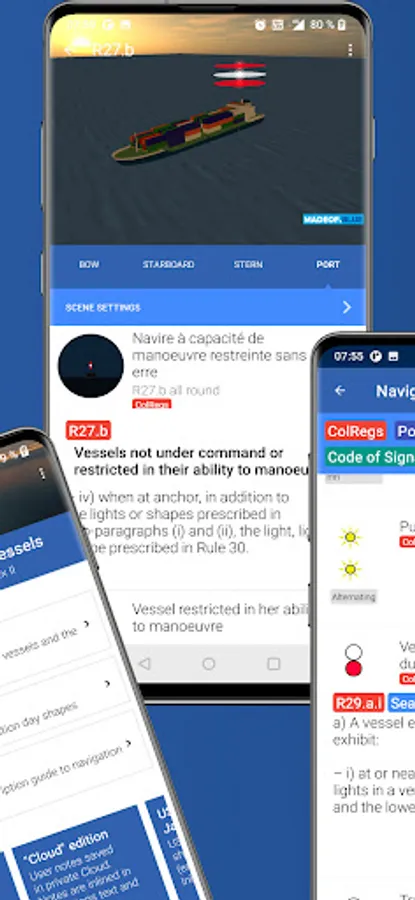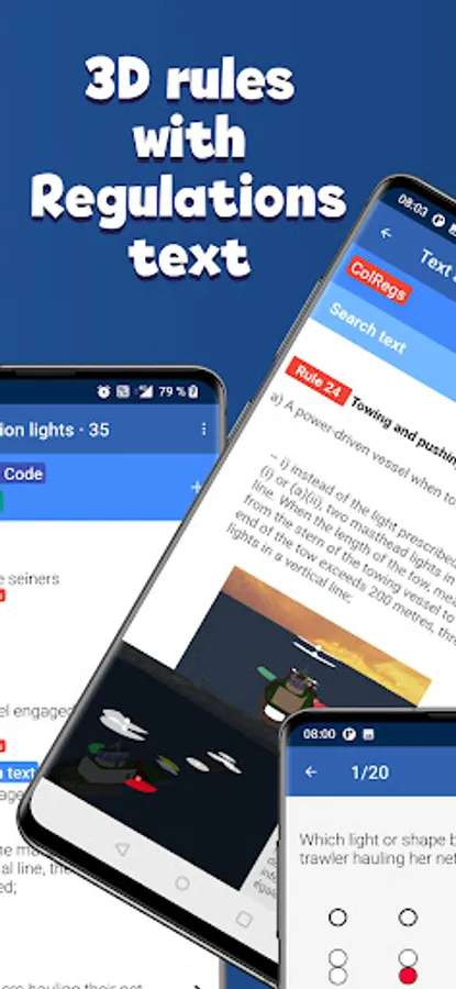 The app, features a light and shapes visual search engine, a thematic rule reference, and provides revision tests as well as a 3D rendering for Colreg rules 20 to 31.