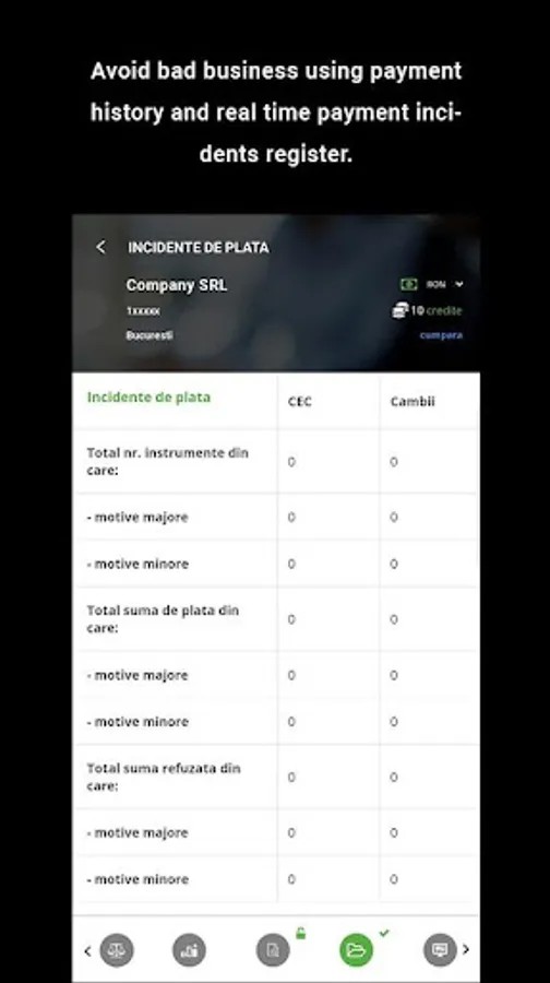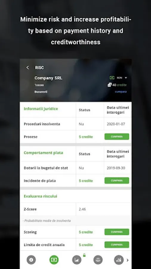The application allows the verification of the financial and legal information of the last three years about the local companies, centralizing data coming from the Trade Register, the Ministry of Finance, the National Agency for Fiscal Administration, the Official Monitor, the Ministry of Justice and the public portal of the Government of Romania. The application also contains general data about companies, such as status, address and contact details, the database having a total of approximately 4.2 million entities in Romania.