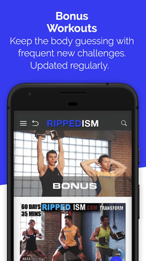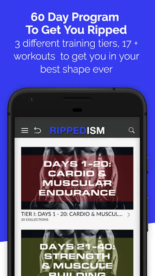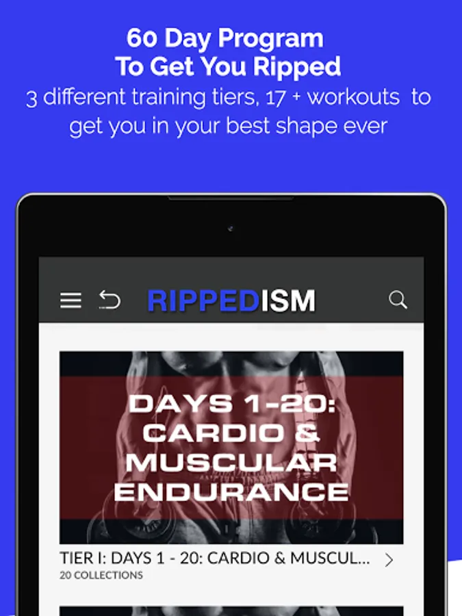 Rippedism 1 and 2 are intense workout programs that will burn fat and build lean muscle. Both programs consist of no more than 35 minutes of high intensity interval workouts per day structured over 60 days and can be done with little equipment. Can follow program calendar in app or skip around as desired. Will challenge advanced members but will welcome beginners with modifications.