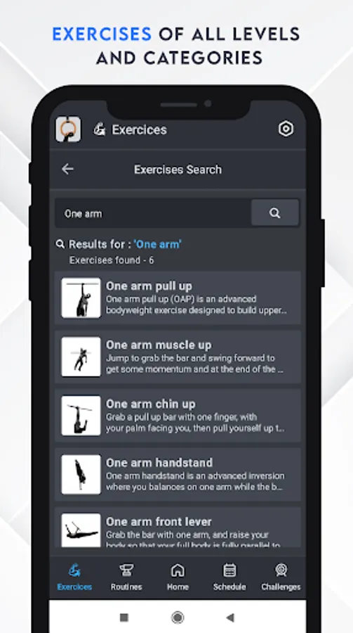 The application includes a wide range of bodyweight and calisthenics exercises with different variations and levels like Pull up, push up, as well many advanced moves like: