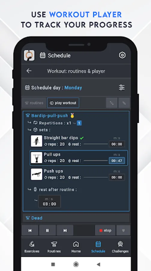 CaliStrength is built to give you full control on the whole app and provides functional tools and features like workout player, which is one of the core parts of this app. After you design your routines, you start attach those routines to your workout. Once you have routines in place, and workouts ready, you can use the workout player to either play the workout using auto-play mechanism, or using the manual controls to progress the workout sets and routines. Player gives you sets repetitions counter as well as rest between sets and routines counters and more settings.