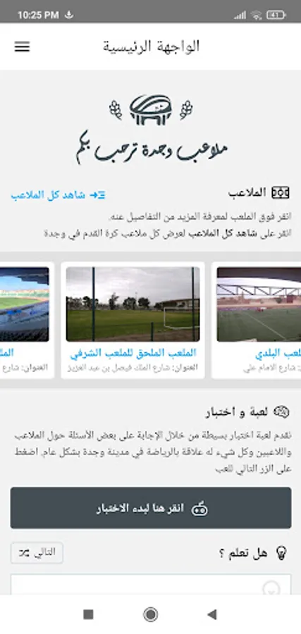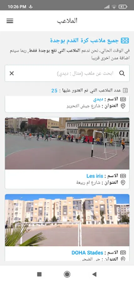 The Oujda Stadiums application aims to monitor all football stadiums in Oujda, including proximity stadiums and large stadiums in which official matches are held. This application contains almost all stadiums and displays some information about the stadium, such as the name, location on the map, and some pictures.