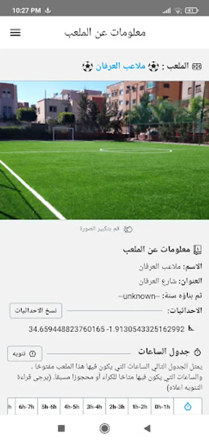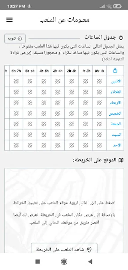 The main feature in this application is displaying the hours during which the stadium is available for rent in the event that the stadium is rented or the hours during which it is available for training or playing so that we give the authority to manage the stadium for each official so that he can set the hours and information related to the times that pertain to the stadium that he runs .