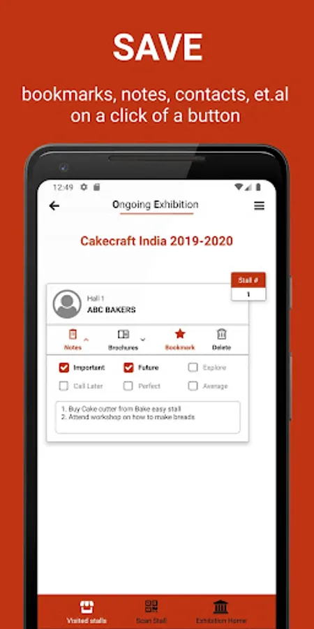 Intuitively tag, bookmark, take notes and save contacts of every stall you visit.