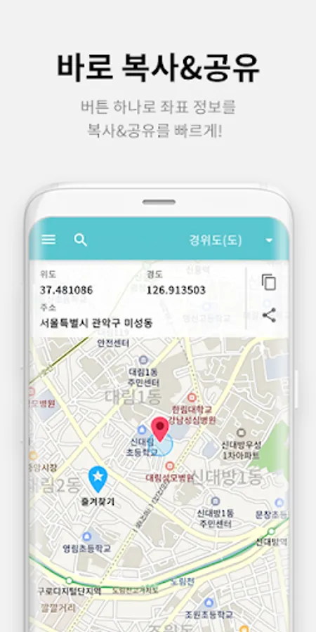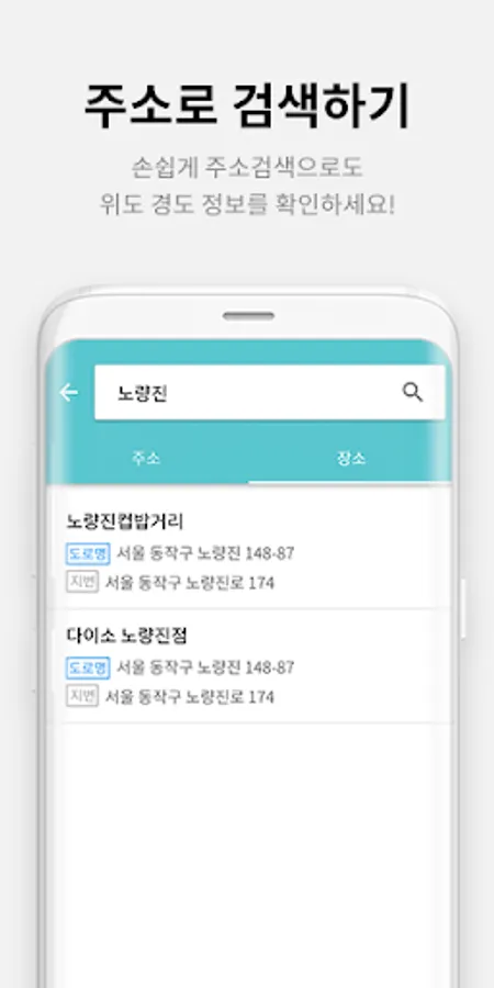 As you move the map center to the location where you want to know the latitude and longitude, you'll see latitude, longitude, and TM coordinates information and addresses for that location. Click on the [Current Position] icon in the upper right corner of the screen and wait for a while to move the map to its current position and display the icon.