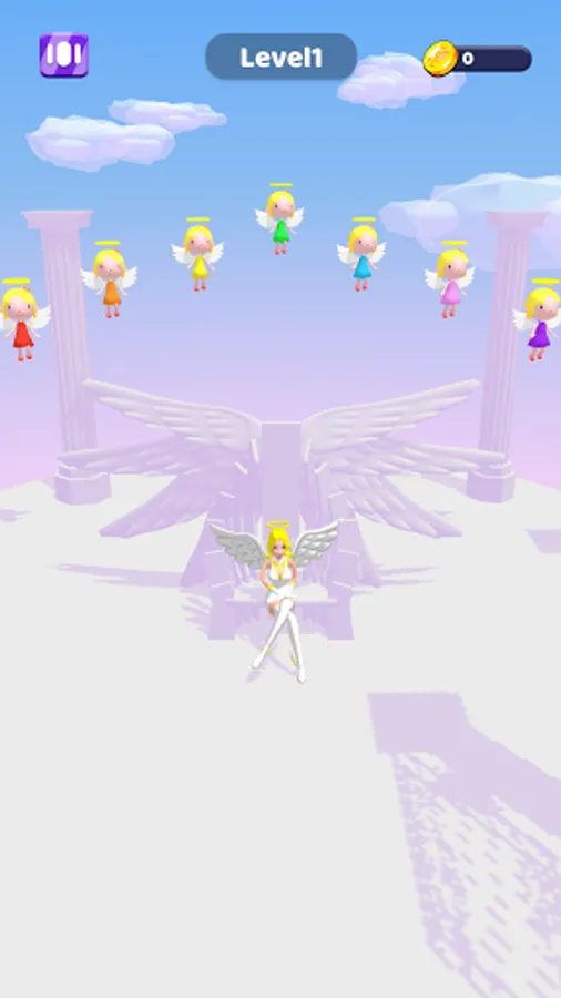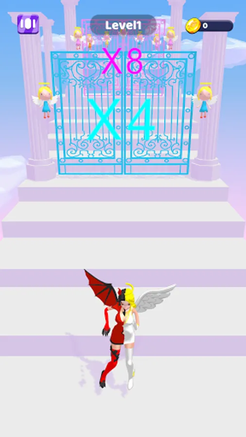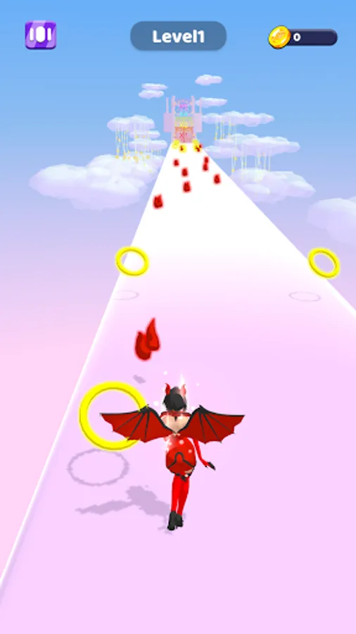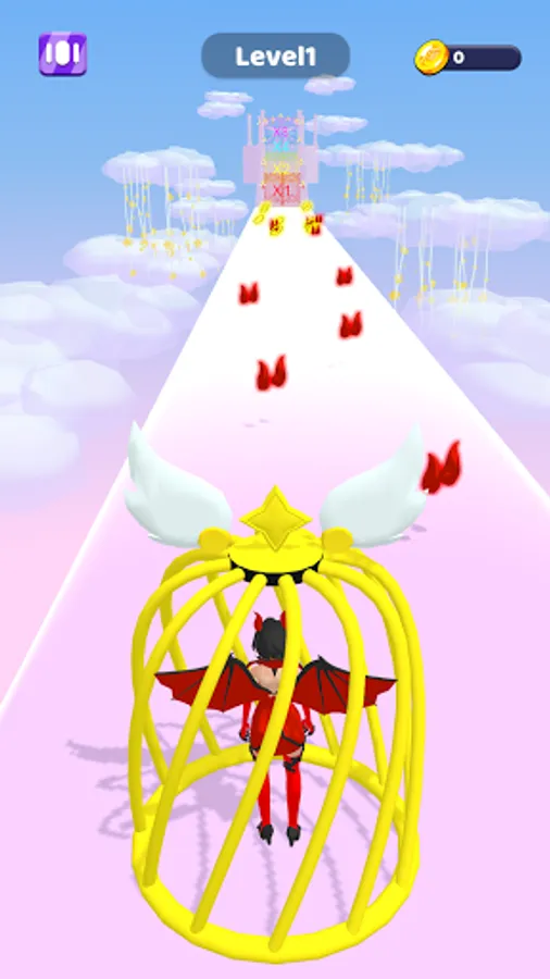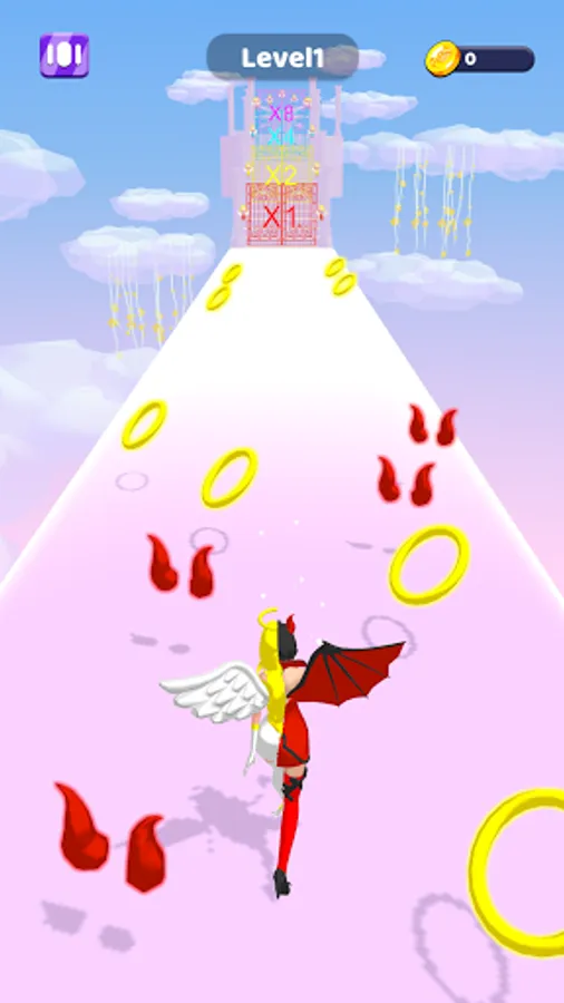 In the beginning, half of your body is an angel and half a demon. Collect the halo of the angel to make you completely an angel, but be careful to avoid the magma and the devil's horns.
