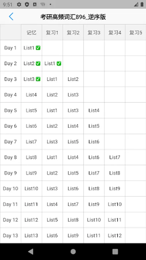 Answer: The learning of each day consists of two parts: `memory` and `review`. In Day2, there are List2 memory and List1 review. Both of them have completed `clock in`, and you can click on the right arrow at the top to switch to Day3.
