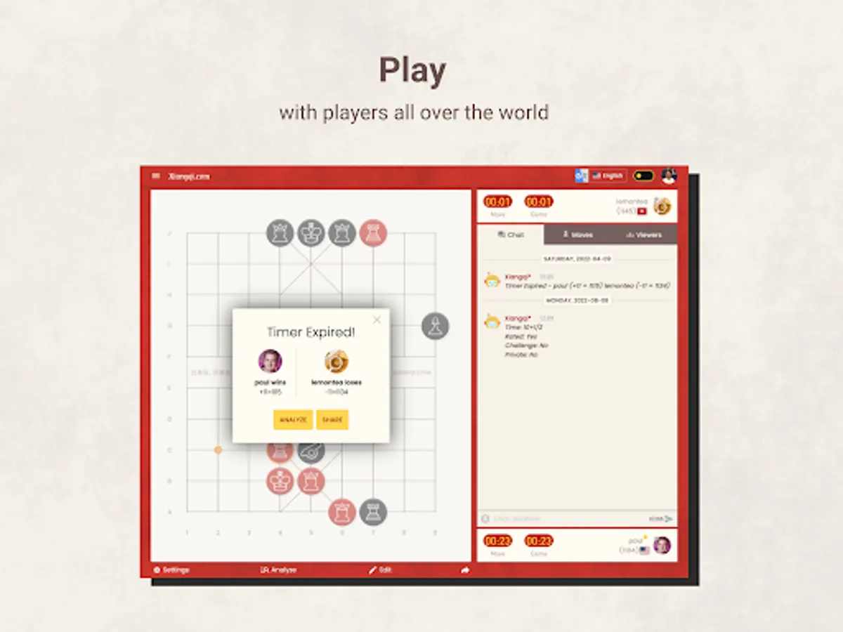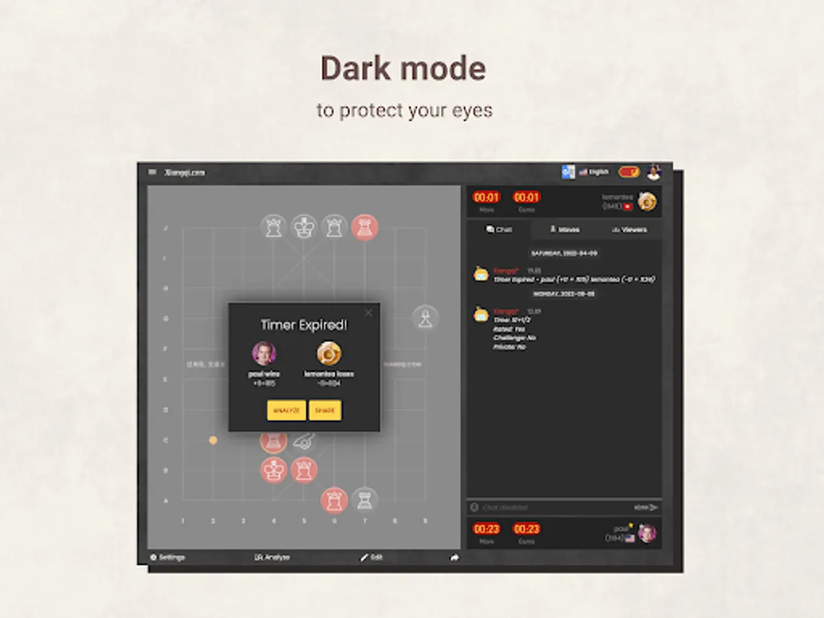 ✓Create 2 player online Xiangqi games and join games created by others: you can choose different game times, increments, move times, and sides.