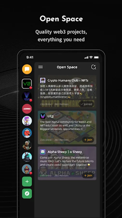 Our featuresEasy to use、 create and manage your spaceFlexible and versatile, build your scene as you likePowerful features, instant communication / knowledge precipitation / information dynamic a space is enoughRich tools, smart contract executor, Members NFT issuance, smart task settlement and other tools built specifically for Web3 users