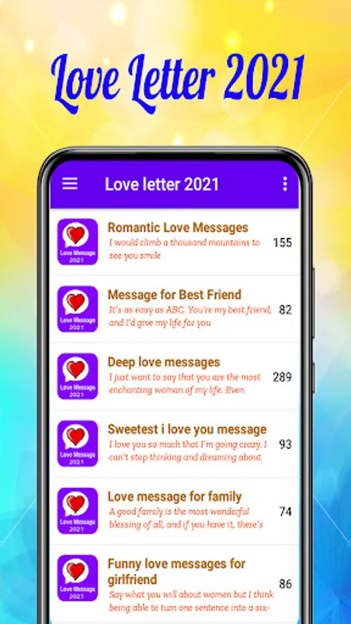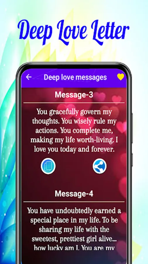 The app will help you find creative ways to say I love you to your loved ones. Send beautiful romantic love letters or share beautiful love messages on Facebook or WhatsApp status. Now send love letters in the form of love letters to your loved ones so that they believe how much you love them. And through this belief, your relationship will be maintained