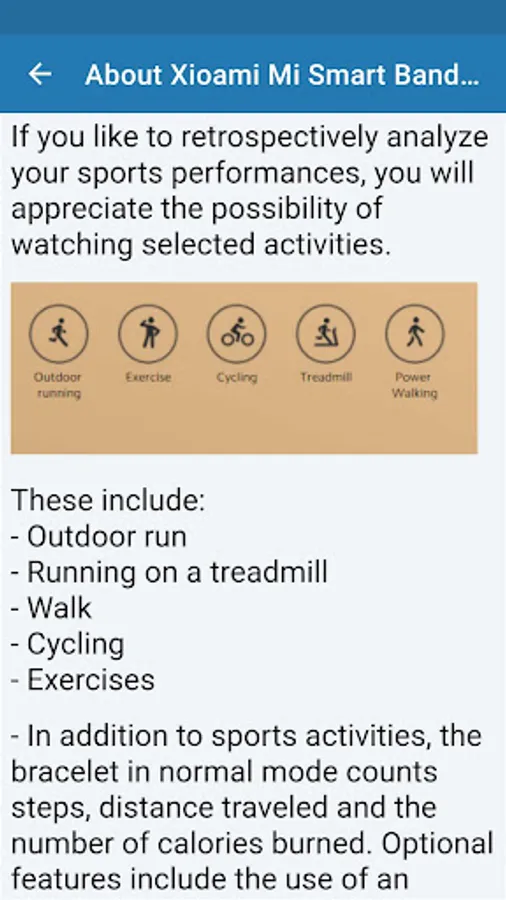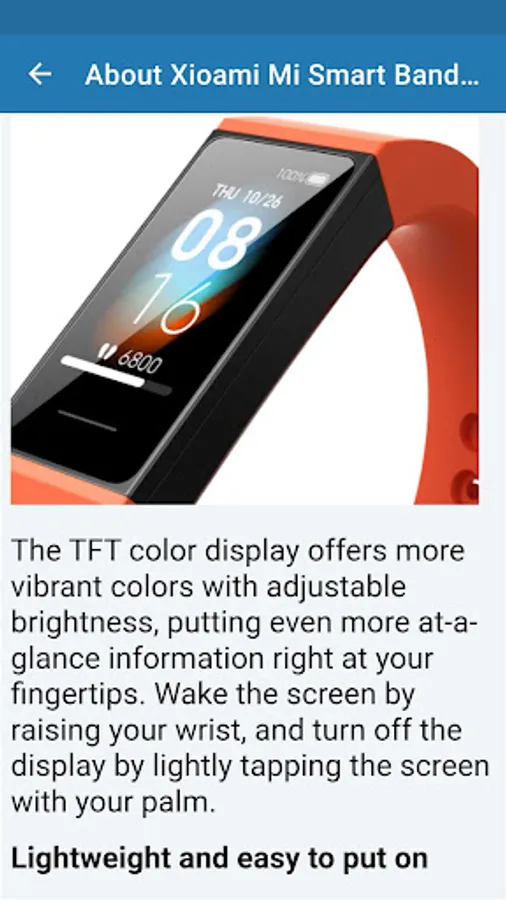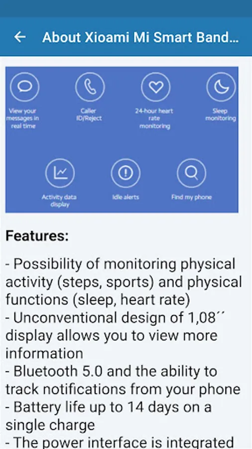 In the content of the mobile app, you can find explanations containing the above titles. This app, in which the features Xiaomi Mi Smart Band 4C are explained, is a guide.