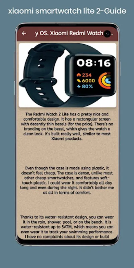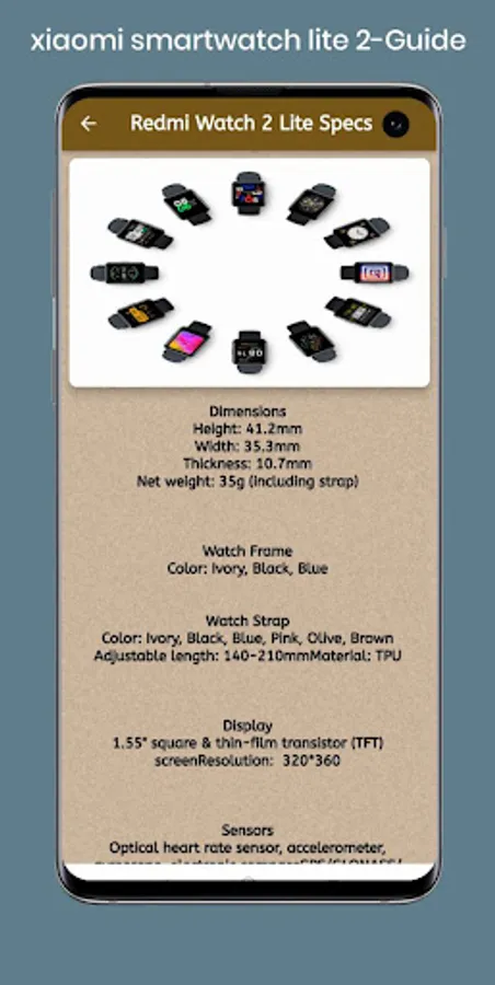 Information and features about the Xiaomi Smart Watch Lite 2 It is a smart watch that comes with an elegant and distinctive design and provides many smart features that make it a great choice for people who want to monitor their health and physical fitness, and it also allows users to connect to their smart phone devices, follow up on incoming calls and messages, and manage applications installed on their smart phones. The Xiaomi Smart Watch Lite 2 features a 1.55-inch high-quality color screen and comes in different sizes to fit different wrist sizes. The watch also includes a variety of smart sensors such as a heart rate sensor, sleep tracking sensors, and an infrared sensor for measuring body temperature. The Xiaomi Smart Watch Lite 2 also supports a range of pre-installed smart apps, such as exercise apps, fitness tracking apps, and multiple apps to manage messages, notifications, and incoming calls. The Xiaomi Smart Watch Lite 2 manual has many features and functions that help users use the watch efficiently and easily. The watch's manual provides information on how to set up the watch, connect it to a smartphone, install apps, and control various settings. The watch guide also provides tips on how to make the most of the smart features available on the watch, such as health and fitness monitoring, controlling incoming calls and messages, and more.Redmi Watch 2 lite App Guide Features :A. are you looking for pictures redmi watch 2 liteB. are you looking for redmi watch 2 liteC. are you looking for redmi watch 2 lite amazonD. are you looking for redmi watch 2 lite descriptionE. are you looking for redmi watch 2 lite features & detailsF. are you looking for redmi watch 2 lite specificationsG. are you looking for specifications redmi watch 2 liteH. do you know the differences between a redmi watch 2 liteI. do you know what are the advantages of redmi watch 2 liteJ. do you know what are the advantages redmi watch 2 liteAll information is present in this application