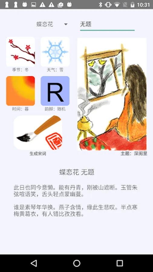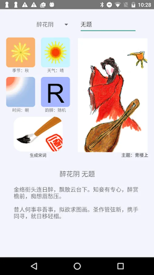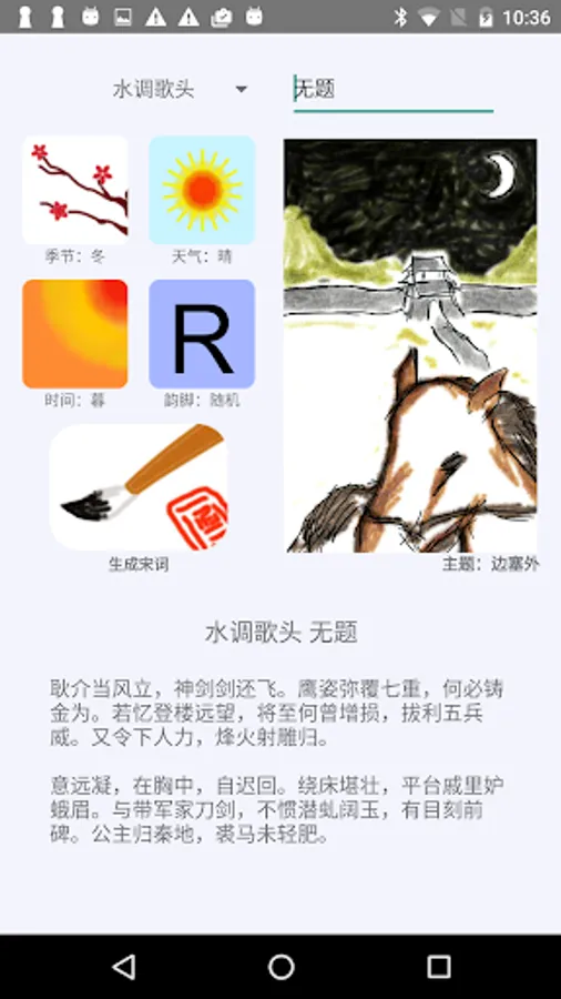 Songci is a format of Traditional Chines Poetry and is still very popular among Chinese literature. In this app we trained model based on , a book collecting hundreds of the Songci in history, to generate a new Songci piece based on user's preference and configurations (weather, season, theme, etc). It definitely worth a try!