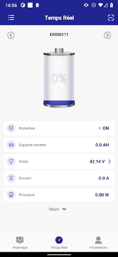 3) Affichage des informations détaillées sur le fonctionnement de la batterie dans l'onglet "Temps Réel", y compris : le pourcentage d'état de charge, la tension, le courant, la température de la batterie, etc.