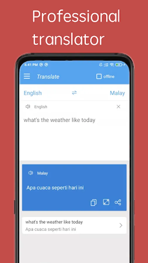 Using inbuilt voice recognition technology, you can type your text using your voice and then translate the text. This convenient feature allows you to translate regular conversations. You can translate your Malay voice to English and English voice to Malay.