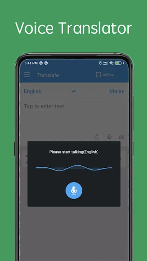 A) Click on 'Mic' button and say the text. Once you are finished with voice typing, click on 'Translate' and Malay to English Translator app will translate the text.
