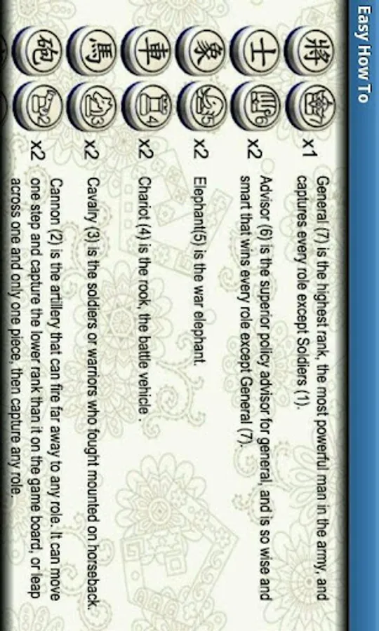 Chinese Dark Chess , or Half Chess, is a two players board game, played on a 4x8 grid. Most games last between ten and twenty minutes. It is a social game, usually played for fun rather than serious competition.