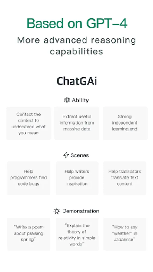 ChatGAi Pro is committed to becoming your indispensable partner in life, providing comprehensive and professional support wherever you are. Download ChatGAi Pro now and start your smart, convenient future life!