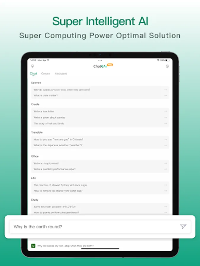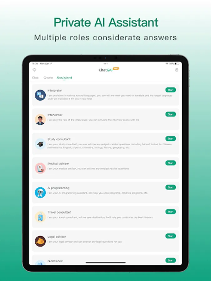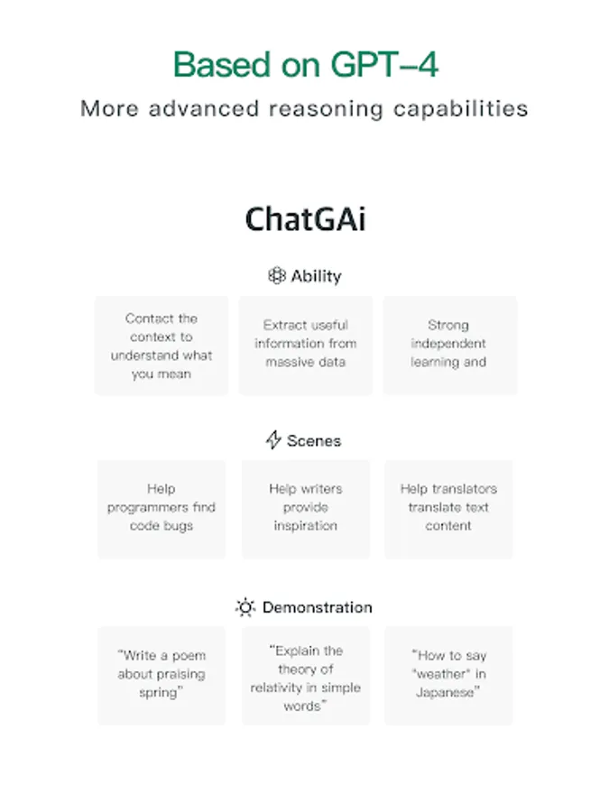 ChatGAi Pro is an all-in-one app integrated with the most advanced artificial intelligence technology, dedicated to meeting your various needs in work and life. With outstanding Ai chat, Ai creation, Ai painting assistant, Ai personal assistant, and other features, ChatGAi Pro imitates human conversation, providing you with a realistic and natural dialogue experience, while leveraging its powerful self-learning capabilities to achieve true autonomous creation. No matter what role you need, ChatGAi Pro can provide comprehensive support: