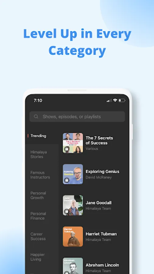 Himalaya gives you the opportunity for a true self-improvement journey. Our stories will inspire and motivate you, while our courses will give you the skills and knowledge you need to set and achieve your most ambitious goals. Audio makes it easy to listen, and become part of a like-minded community making progress every day.