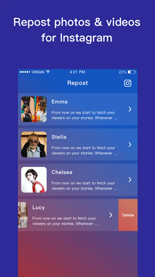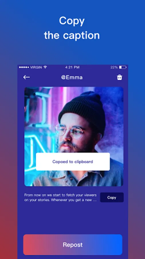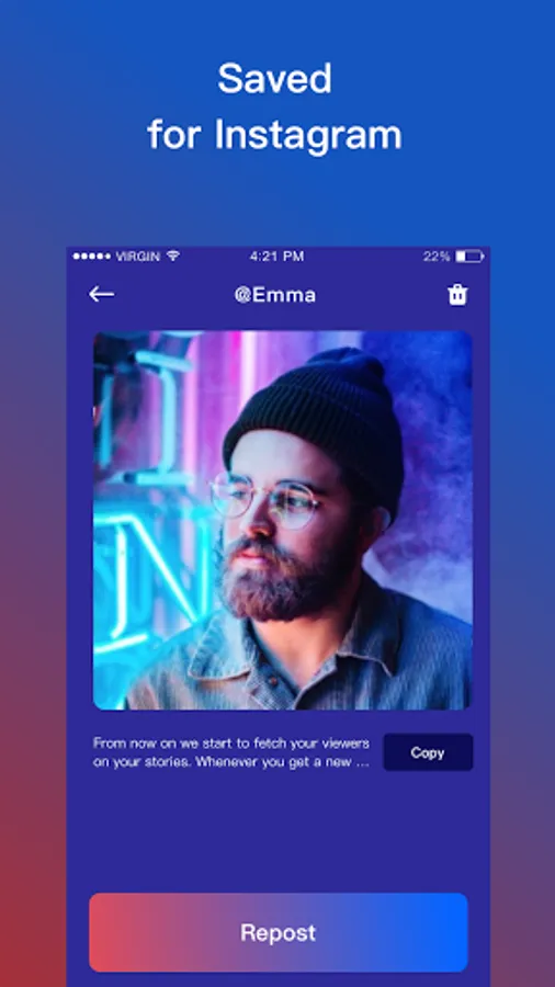 You can view downloaded video and images. You can also easily copy hashtags and captions for the repost.
