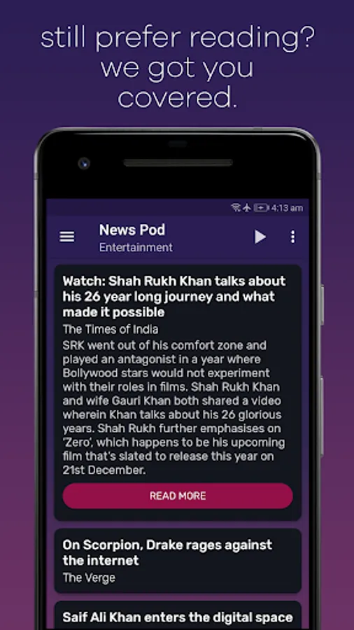 Not able to catch up with the world? News Pod is here to help you. Plug in your earphones and relax your eyes. Listen to news summaries collected from several sources and categorized broadly. Now feed your brain while gyming, walking, travelling, cooking, driving, anything!