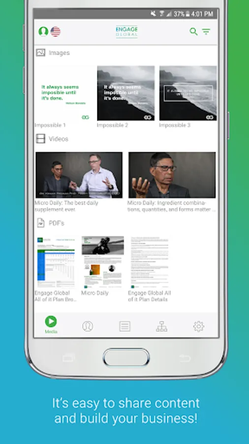 With the Engage Global app, you can easily share your way to success with digital tools that create word-of-mouth buzz and complement belly-to-belly efforts! Connect with new contacts and interact with your team by sharing exclusive, corporate-approved content and digital tools. You’ll have a vast array of marketing materials, videos, social assets, and more—all right at your fingertips! The powerful, yet beautifully simple design, along with compelling tools, makes growing your business simpler than ever.