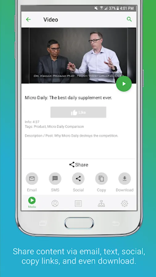 Media: It has never been easier to share information about your products and opportunity via SMS text, email, or social media. Simply choose from the library of content and digital tools specifically designed to promote your business and share them with a contact. You'll even receive a notification when they view the tools so you know exactly when to follow up! No data connection? No problem! Simply download content in the app beforehand for offline playback.