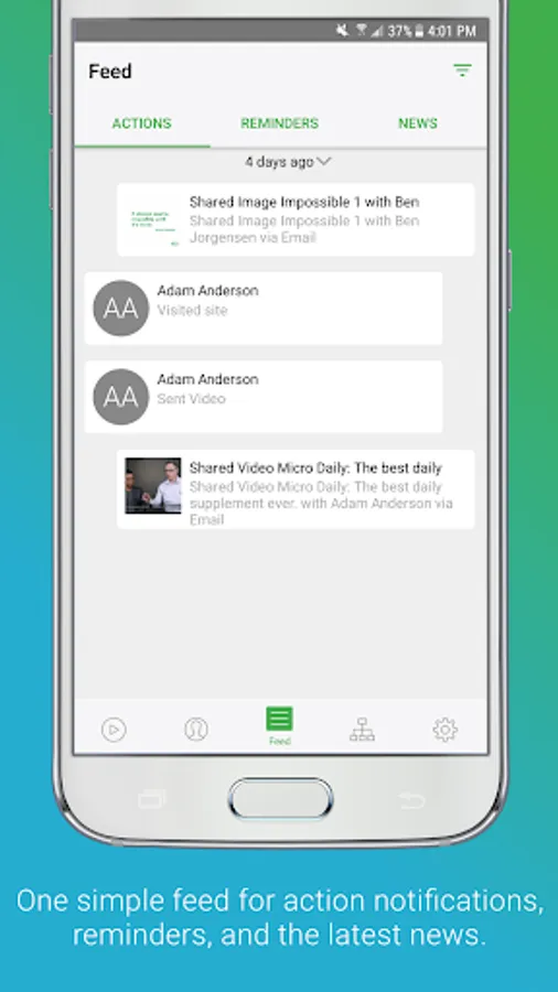Feed: Keep track of everything you’ve shared and see what your contacts have viewed with notifications. You can even swipe notifications to mark them as a Reminder. News also brings all of the latest announcements and social posts from corporate straight to you--in one convenient place!