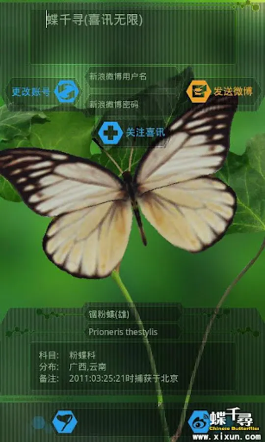 5)微博互动,轻松的将你珍藏的蝴蝶、与蝴蝶合影的照片与朋友分享,彰显你的个性与品味。