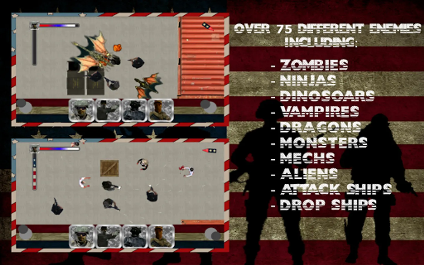 Four immensely patriotic, American soldiers have mysteriously awoken on an island. Having to face off against waves and waves of calamities including Zombies, Ninjas, Dinosaurs, Vampires, Dragons, Monsters, Aliens, Mech Warriors (Killer robots), space ships, alien ships, and drop ships, the soldiers must fight through, day and night, in order to survive. Inspired by the old AVP (Alien vs Predator movies), our heroes quickly find they are either being hunted for sport or being tested for weaknesses, like some sort of lab experiment. Survival against everything the enemy has will prove that America cannot be conquered and a future invasion would be futile. Defeat would signify that America might have some sort of weakness that the enemy could exploit. Little does the enemy know, America has no weakness! Defend your base (Tower defense)! Join the fight, show them that the USA will not be defeated. Show them what freedom and liberty is all about! The world is depending on you, make your country proud!