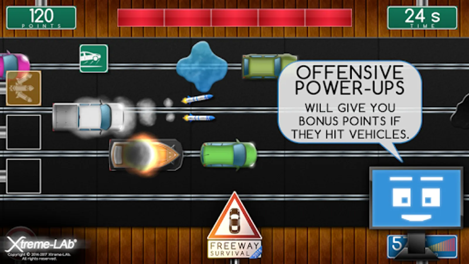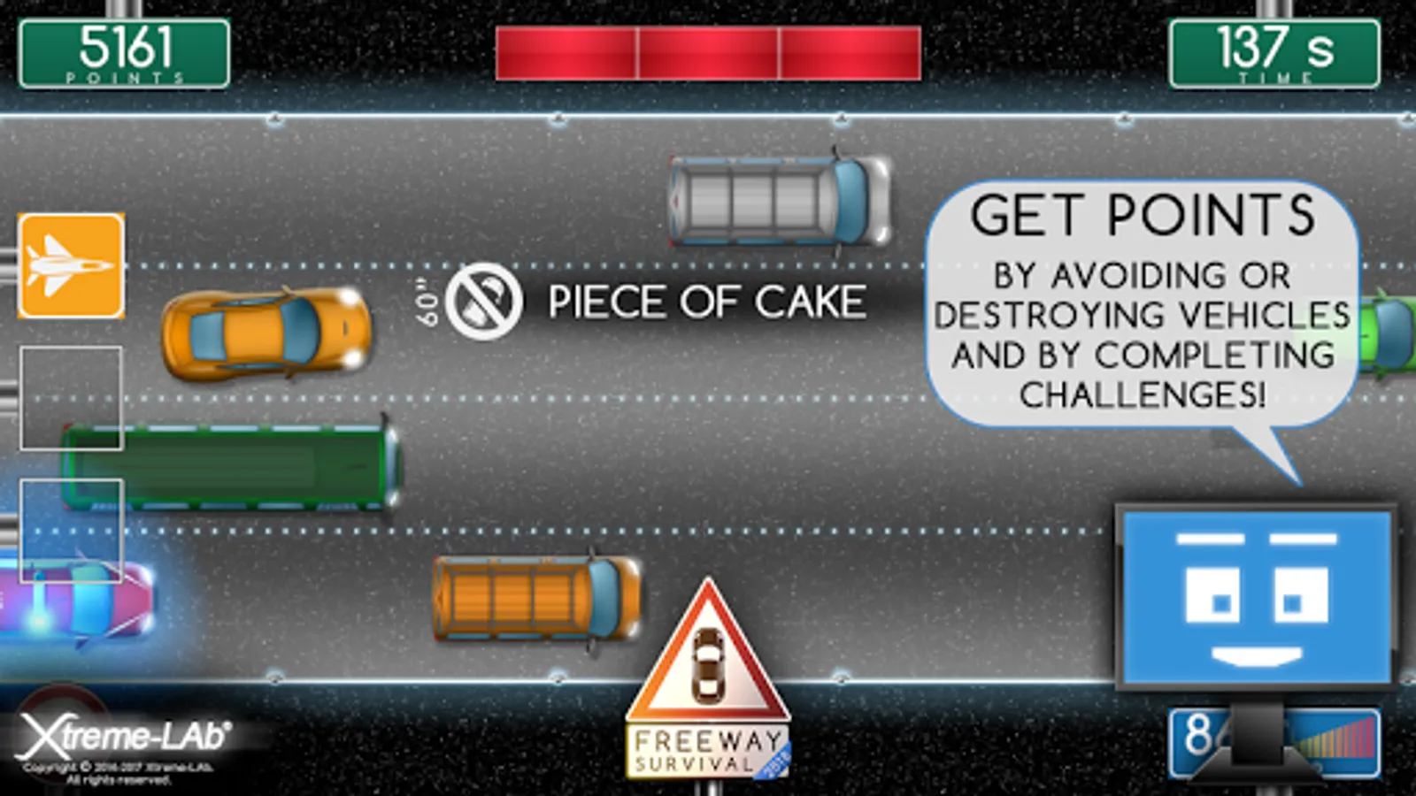 -Get points by avoiding or destroying vehicles, by completing challenges and by using power-ups;