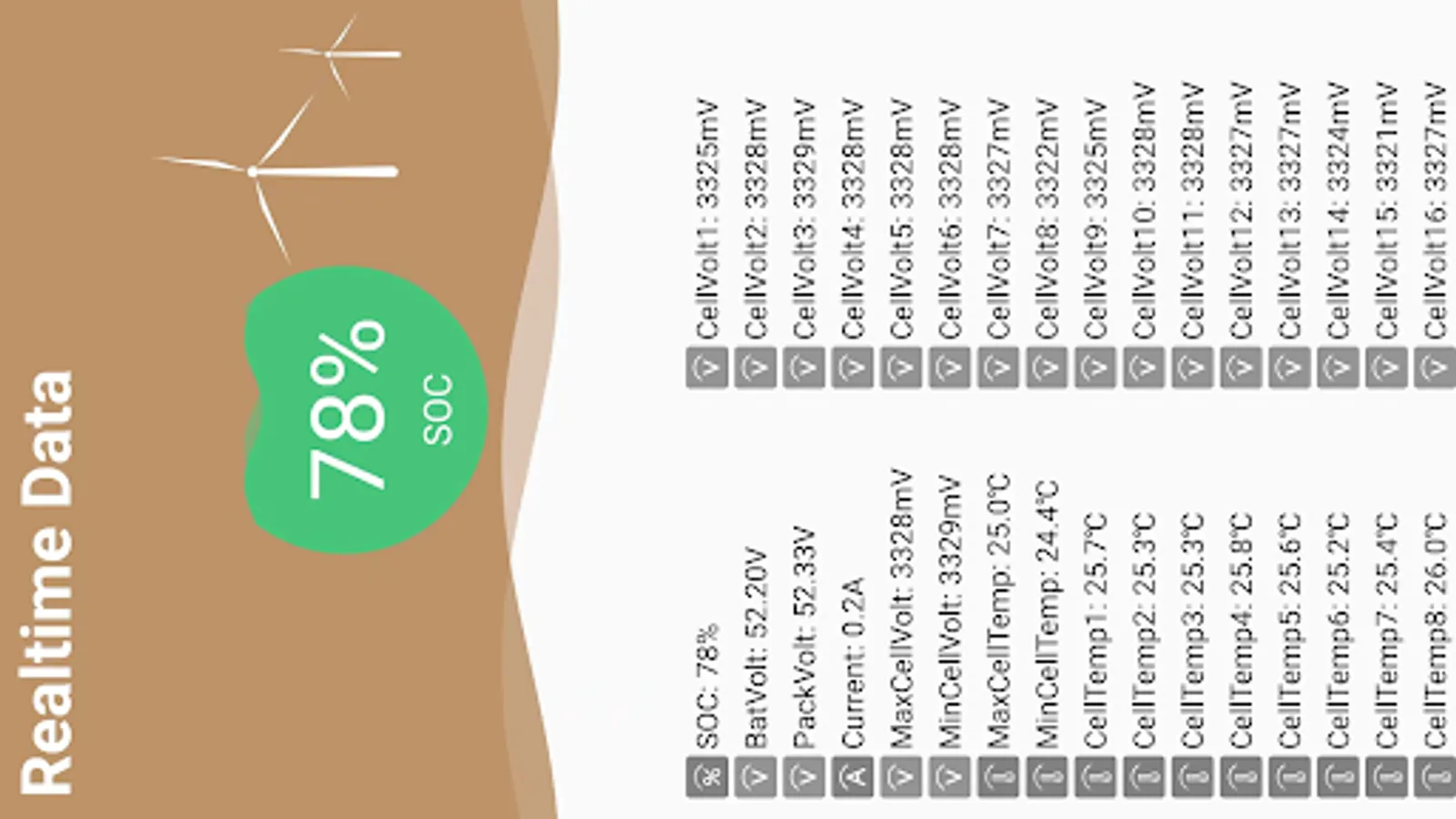 This is a BMS Bluetooth app. It is used for communication and connection with lithium battery devices. It can clearly see the current voltage situation, capacity, temperature changes, and SOC data of lithium batteries. It can also switch RS485 protocol and CAN communication protocol for various brands of inverters, making it convenient for users to use inverters of different brands. It can also allow customers to upgrade their lithium-ion batteries with the app, making it easier for users to use lithium-ion batteries better.