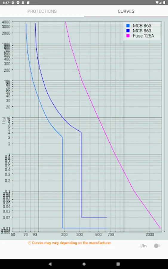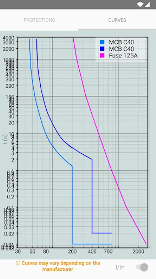 · Circuits with automatic circuit breaker until In = 4000 A (Ir rating setting), maximum fuse In = 1600 A (gG type), maximum 12 conductors parallel per phase, maximum size 630 mm²