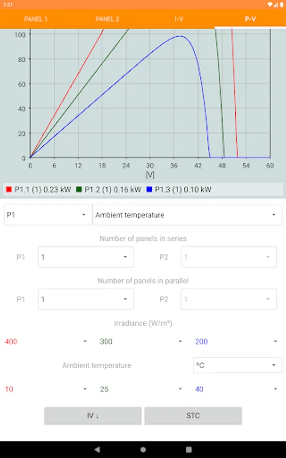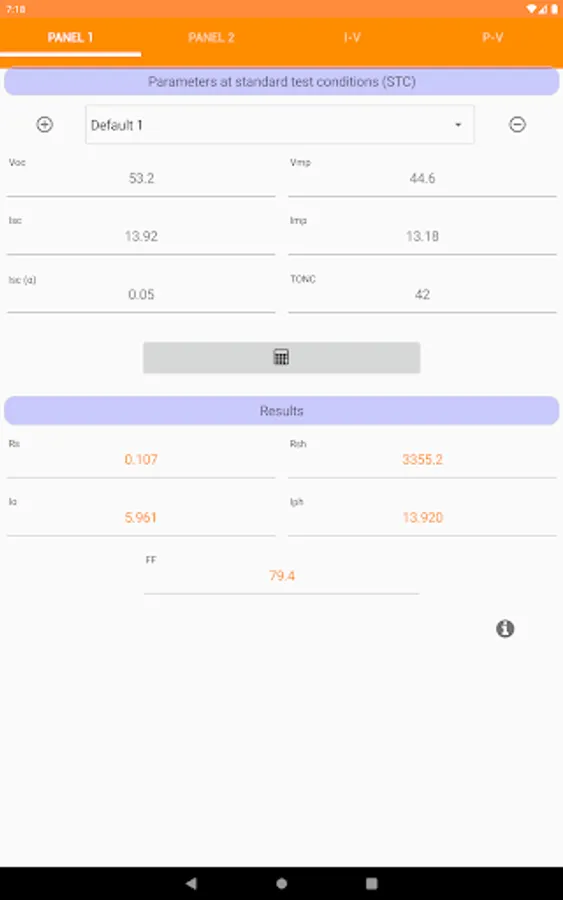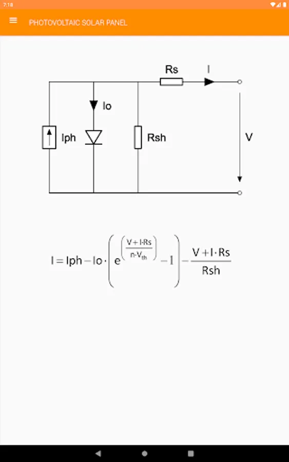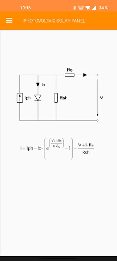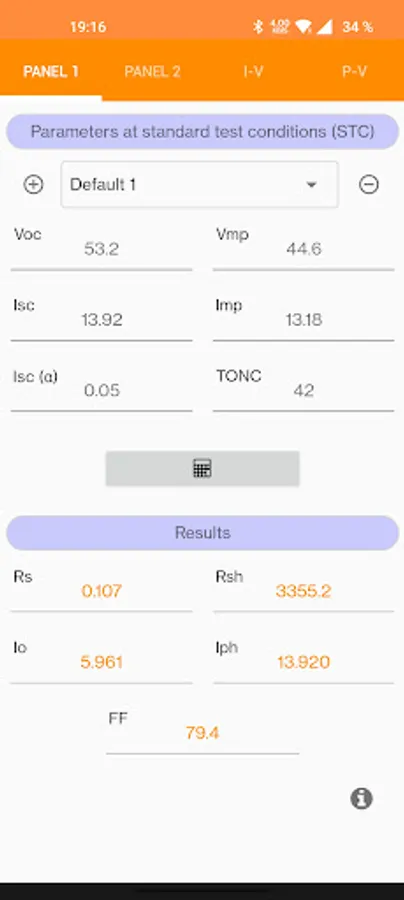 'PV module' solves the simplified equation of the photovoltaic module with a single exponential and five parameters, from the test data (Voc, Vmp, Isc, Imp) of the photovoltaic panel under standard test conditions (STC: 1000 W/m² of irradiation, 25ºC cell temperature, spectrum AM 1.5g) provided by the manufacturer.