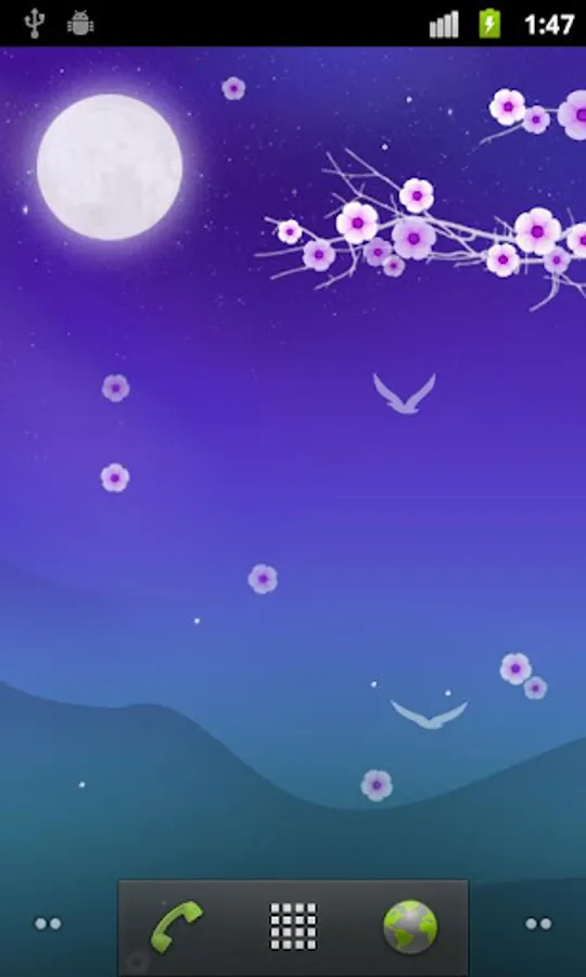 A beautiful blooming night live wallpaper featuring flower and birds flying in an enchanted night scene.