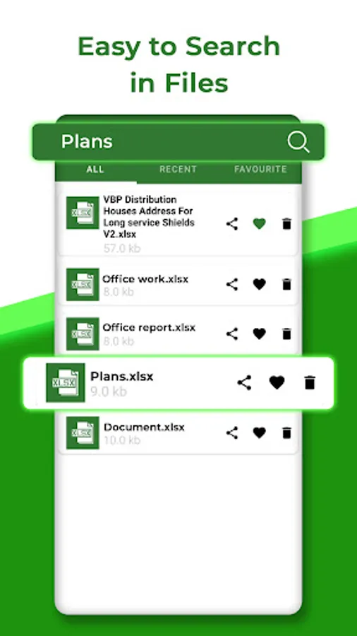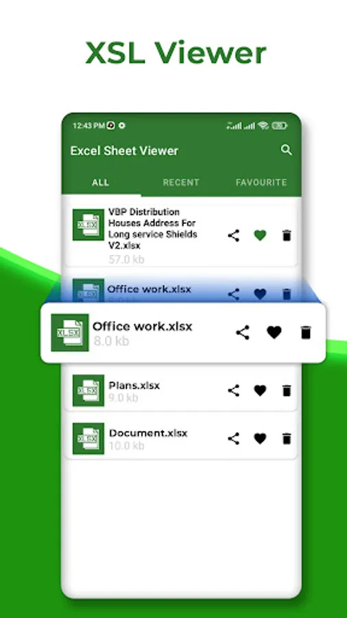XLSx file opener app can share your xls files directly with your friends & social media or can share in a direct message.XLS file viewer is useful tool for everyone. You don’t have to carry a laptop with you for all documents, with xls viewer you can view & read all xls files instantly. With xls reader you can also delete unwanted xls files from your device & save space on the phone. For instantly opening xls files you can add your important xls files into favorite section of the xls viewer app.