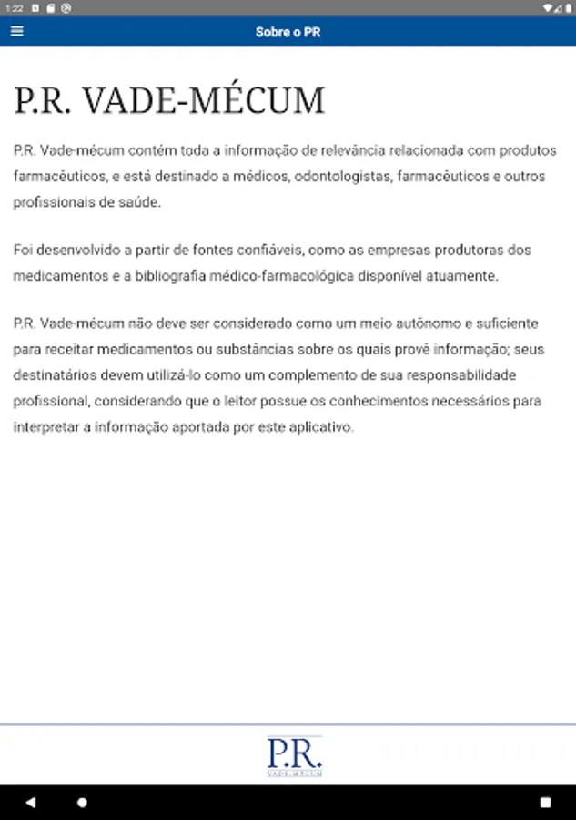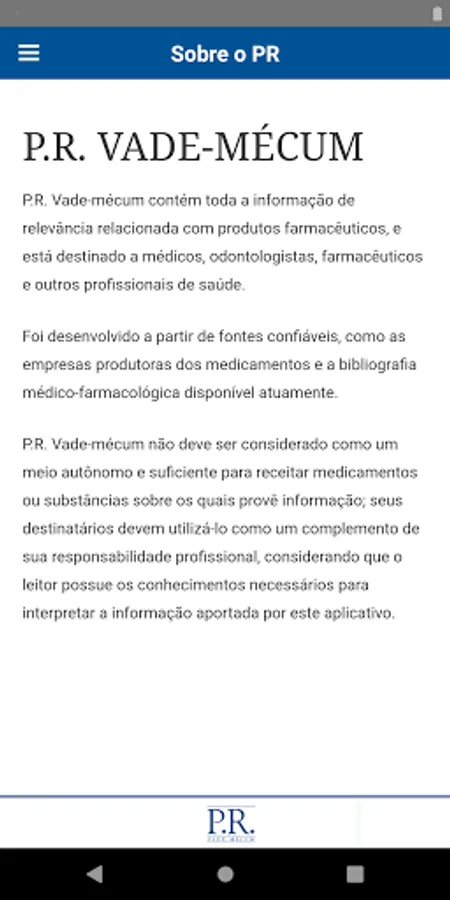 PR Vade-mecum should not be considered as an autonomous and sufficient means to prescribe drugs or substances about which it provides information; its recipients must use it as a complement to their professional responsibility, considering that the reader has the necessary knowledge to interpret the information provided by this application.
