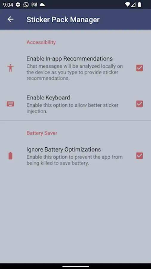 Sticker Pack Manager uses accessibility services to monitor when you're typing into a chat app messaging box. Sticker Pack Manager processes what you're typing locally and never uploads or records this information. Relevant stickers will then by shown dynamically as you type above the messaging box. Accessibility services are optional and you can copy or share individual stickers within the app as well.