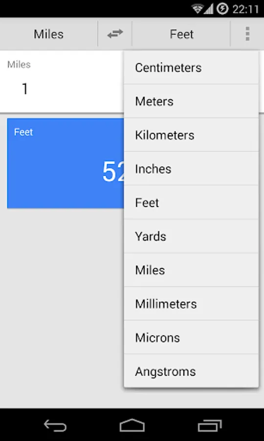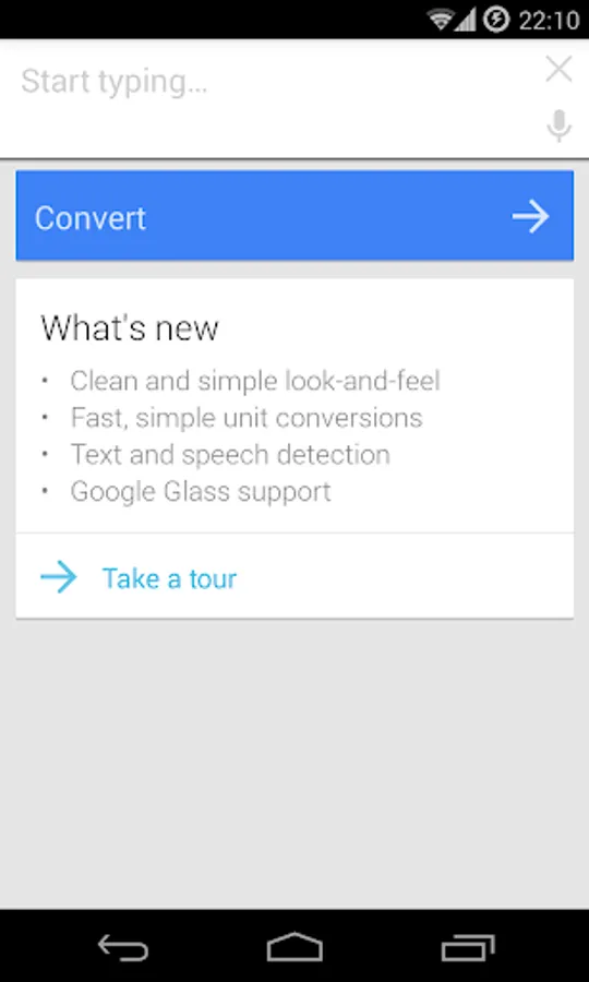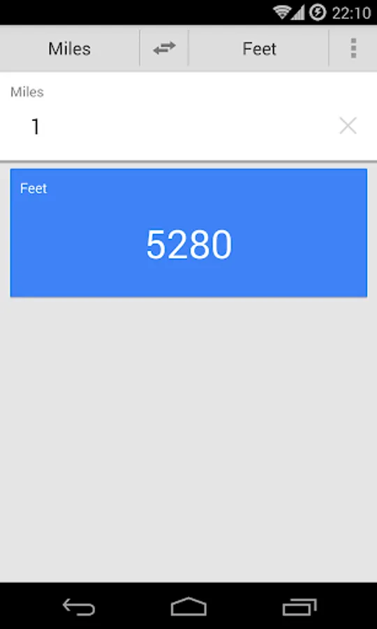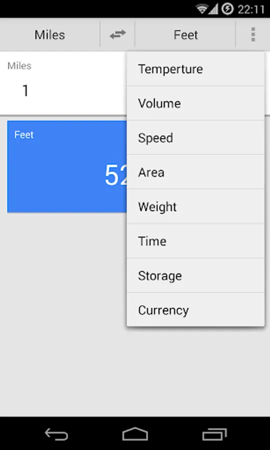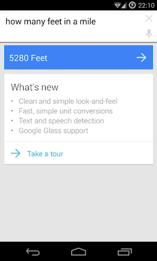 The app supports free-form typing, so feel free to ask it questions like "How many feet in a mile?", "Convert 15 tsp to tablespoons", and even "1 USD to BTC". Everything except currency conversions will work offline. Hit Convert for even more options.