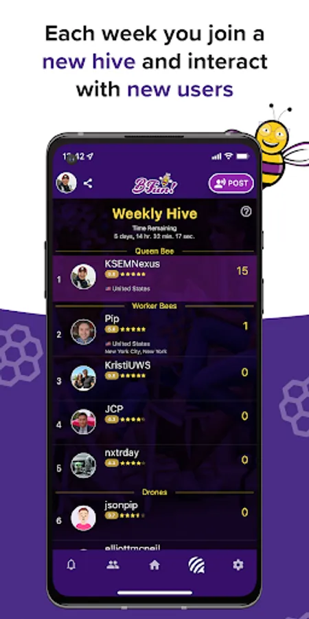 Each week you'll compete with others to become Queen Bee of the Hive to increase your user rating.arn points and crowns for your contributions. Each week you're assigned to a Hive where you engage in friendly competition with others to become Queen Bee and increase your user rating. And the best part is, everyone receives a mutual benefit - whether you’re the Queen Bee who found the spot or subject, or a user who gets to hear about something or somewhere new!