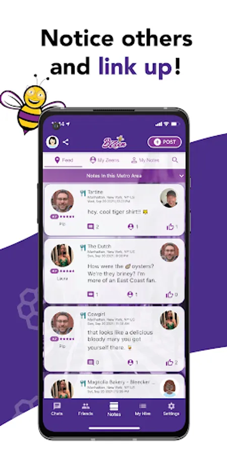 Getting involved in the BZeen network is simple! To start, post a Note describing a person you noticed nearby in real life. Include whatever made them stand out to you so that BZeen can find their profile and alert them that they’ve been “Zeen”!