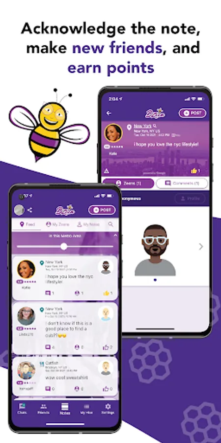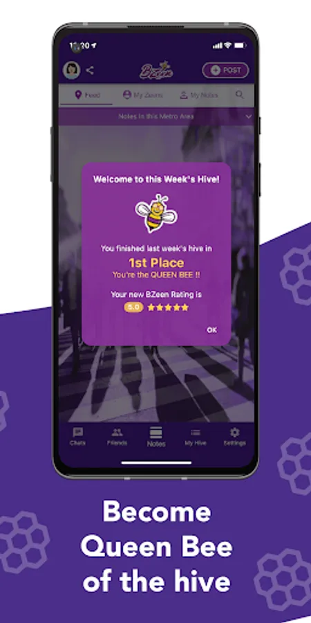 Points can be earned for different actions such as when you are “Zeen”, post a Note resulting in a Zeen, receive comments or “Acks” on your Notes, or when your Notes or comments are liked. Plus, when you’re Zeen and you Ack back to a Note, you receive the mutual benefit of sharing any points that Note receives! At the end of the week your standing in the Hive is calculated into your overall BZeen rating. And the more you participate, the better chance you have of earning enough points to become Queen of the Hive.