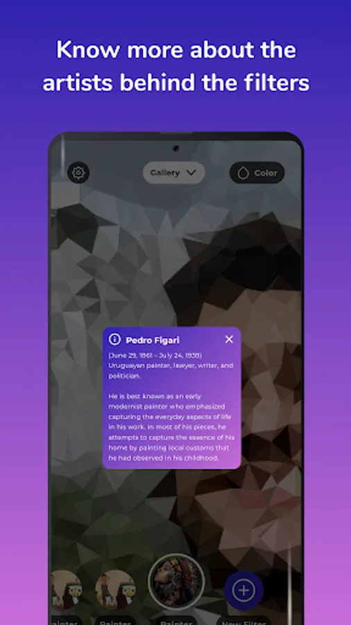 Explore the world through artist-inspired filters with DreamSnap. Feel the augmented reality magic while gazing at your paint-like universe!