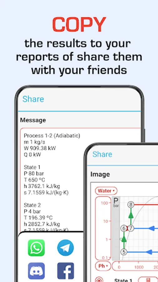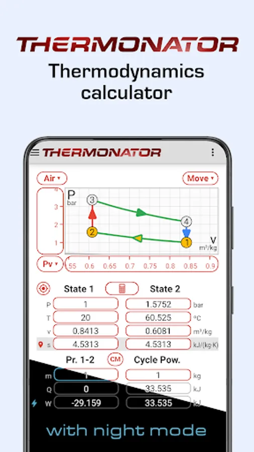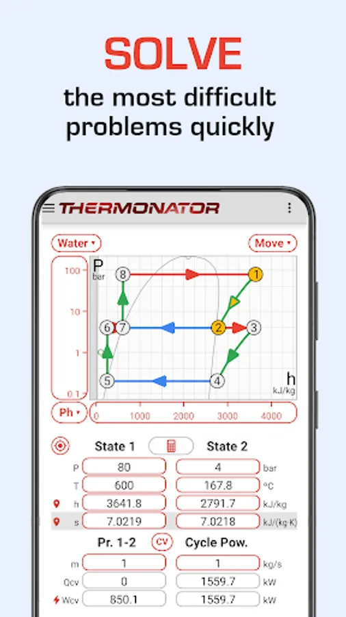 - Interactive diagrams (Pressure-Volume, Temperature-Entropy, Enthalpy-Entropy, Mollier, etc) with linear and logarithmic scales, automatic zoom and draggable rulers.