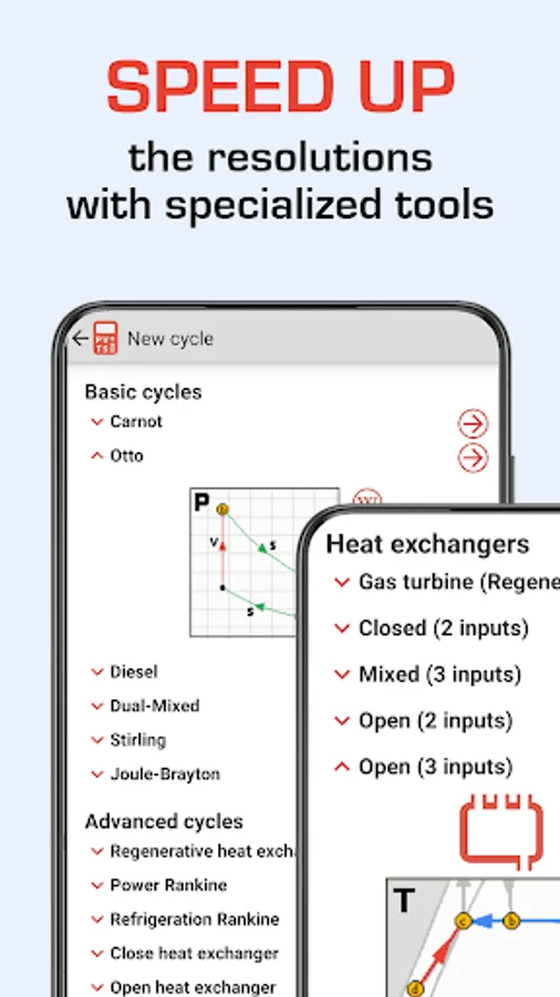 - Automatic calculation of predefined cycles: Carnot, Otto, Diesel, Dual-Mixed, Stirling, Joule-Brayton, Regenerative exchanger, Ideal power Rankine, Basic cooling Rankine, and Rankine with open or closed heat exchangers .