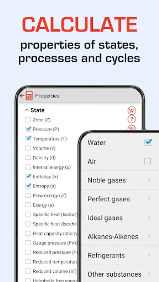 - Substances: Water, Air, Ammonia, Carbon Dioxide, Nitrogen, Oxygen, Alkanes (Butane, Ethane, Heptane, Hexane, Isopentane, Methane, Octane, Pentane, Propane), Alkenes (Ethylene, Propylene), Refrigerants (R11, R12, R13, R14, R22, R23, R114, R123, R134a, RC318, R500, R502, Propyl alcohol), Ideal gases (Water, Air, Ammonia, Carbon monoxide, Carbon dioxide, Methane, Acetylene , Ethylene, Hydrogen, Nitrogen (N), Nitrogen monoxide, Oxygen, Hydroxide (OH), Chlorine, Fluorine, Hydrogen bromide, Hydrogen chloride, Hydrogen iodide, Hydrogen sulfide, Sulfur dioxide), Noble gases (Helium , Neon, Argon, Krypton, Xenon, Radon).