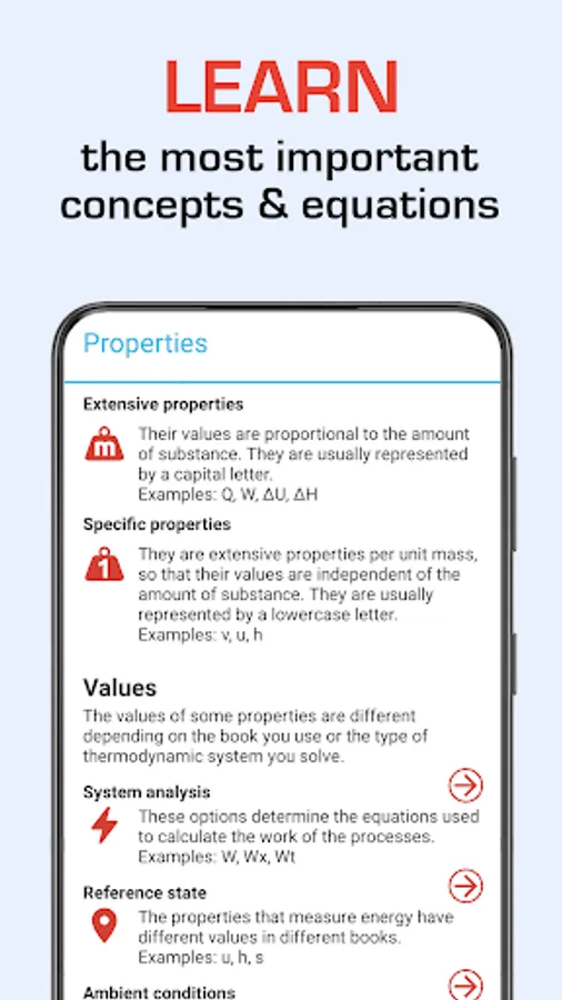 · Explanations of the main concepts, equations and thermodynamic laws.